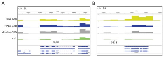 We divided the TEs according to their responses to Piwi-, HP1a- and double-GKD into four groups (Figure 2A). TEs upregulated more than two-fold upon both Piwi- and HP1a-GKDs were classified as group I (marked in red in Figure 2B–D). This group included mostly LTR retrotransposons (copia, mdg3, transpac and others) and DNA transposon bari1 (Figure 2E). The RNA-seq profile for a representative of this group copia is shown in Figure 2F. As a rule, the elements of this group did not show additional derepression upon double-GKD compared to single GKDs (Figure 2C–E). These observations point to the participation of Piwi and HP1a in a single pathway. Presumably, group I TEs are regulated by canonical piRNA silencing, in which Piwi can initiate the establishment of the H3K9me3 mark with the subsequent binding of HP1a required for transcriptional repression. It is also conceivable that the putative function of HP1a in piRNA biogenesis [] may contribute to the lack of silencing of these TEs in HP1a- and double-GKD ovaries.