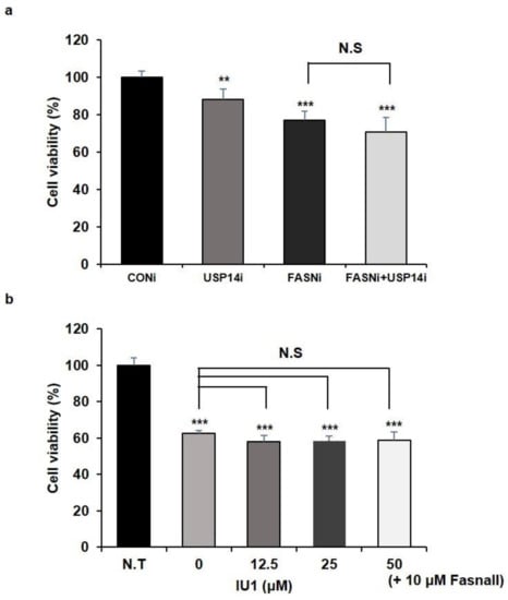 Inhibition of USP14 and FASN together has no synergistic effect on cancer cell proliferation. (a,b) Cell viability was measured by WST-1 assay. LNCaP cells were (a) transfected with siRNA targeting FASN (FASNi) or USP14 (USP14i) for 72 h or (b) treated with Fasnall or IU1 at indicated concentration for 48 h. Data are shown as mean SD and determined by three independent repeated experiments (**; p < 0.01, ***; p < 0.001 t-test). N.S; nonspecific, N.T; nontreated.