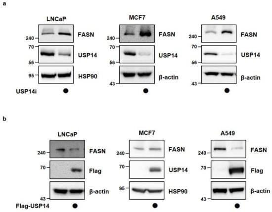 USP14 negatively regulates FASN levels in cancer cell lines. (a) LNCaP, MCF7, and A549 cells were transfected with CONi or USP14i for 48 h. Cell lysates were immunoblotted with the indicated antibodies. HSP90 and β-actin were used as a loading control. (b) LNCaP, MCF7, and A549 cells were transfected with Flag-USP14 for 24 h. Cell lysates were immunoblotted with the indicated antibodies.