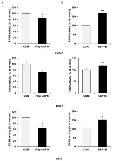 USP14 negatively regulates FASN activity in cancer cell lines. FASN activity was measured in LNCaP, MCF7, and A549 cells transfected with (a) Flag-USP14 for 24 h or (b) USP14i for 48 h. (*; p < 0.05, **; p < 0.01, ***; p < 0.001 t-test).