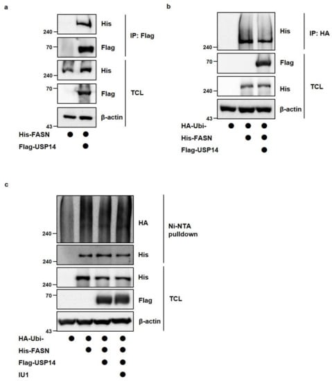 Cells transfected with HA-ubiquitin and tagged plasmids (Flag-USP14 and His-FASN) were treated w/wo 10 μM USP14 inhibitor IU1 (MedChemExpress, Monmouth Junction, NJ, USA) for 24 h. Before harvesting, cells were treated with 10 μM MG132 for 6 h. The cells were lysed with urea lysis buffer (8 M urea, 300 mM NaCl, 50 mM Na2HPO4, 50 mM Tris, 1 mM PMSF, 10 mM Imidazole, pH 8) and sonicated. About 5 mg of lysates was incubated with HA-agarose beads (Thermo Fisher) or Ni-NTA agarose (Qiagen, Hilden, Germany) for 6 h at 4 °C. The beads were washed with urea washing buffer (8 M urea, 300 mM NaCl, 50 mM Na2HPO4, 50 mM Tris, 1 mM PMSF, 20 mM Imidazole, pH 8) five times and eluted in 6X SDS sample buffer. Samples were detected by the same procedure indicated for immunoprecipitation.