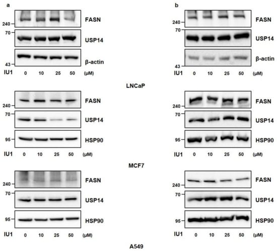 Since USP14 reduced FASN protein levels in cancer cells, it was necessary to confirm the deubiquitination of FASN by USP14. Before that, we checked the interaction between USP14 and FASN when Flag-USP14 and His-FASN were cotransfected (Figure 4a). To identify the ubiquitination of FASN, we transfected LNCaP cells with His-FASN, HA-ubiquitin, and Flag-USP14 together. As shown in Figure 4b,c, USP14 slightly reduced FASN ubiquitination. However, treatment of USP14 inhibitor IU1 did not significantly alter the ubiquitination of FASN (Figure 4c). In addition, when LNCaP, MCF7, and A549 cells were treated with different concentrations and incubation times of IU1, there was little difference in FASN levels compared to the control cells (Figure 5a,b). Taken together, these results indicated that FASN binds to USP14 but may not be a direct substrate of USP14, and the expression level of USP14 is more important in modulating FASN levels than the activity of USP14 in cancer cells.