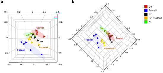 Next, we wondered whether inhibition of USP14 activity affects FASN-involved lipid metabolism. To determine the simultaneous effects of FASN and USP14 inhibition on the metabolite profile, we carried out an untargeted metabolomic analysis using UPLC-Orbitrap-MS/MS in positive and negative ion modes following 24 h of exposure of LNCaP cells to each and both of Fasnall and IU1. A total of 460 and 857 features were detected in the positive and negative ion modes, respectively. A principal component analysis (PCA) was initially performed using the LC-MS/MS datasets for each peak extracted from the Compound Discoverer 2.0 to obtain the natural clustering trend for each group. As shown in Figure 6a,b, apparent clustering and separation were observed among the groups and clearly showed the difference between the Fasnall vs. IU1 treated group in both ion modes. These results clearly showed the difference in the metabolite profiles among Fasnall-treated vs. IU1-treated vs. both treated groups.