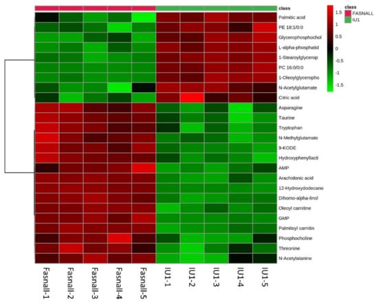 Heatmap analysis of USP14 and FASN inhibitor-treated LNCaP cells. The heatmap represents the intensities of the 25 most significantly (p < 0.05) altered metabolites between groups. Group is indicated at the top of the figure by red (Fasnall, n = 5) or green (IU1, n = 5). Data were sum normalized, log transformed, and autoscaled.