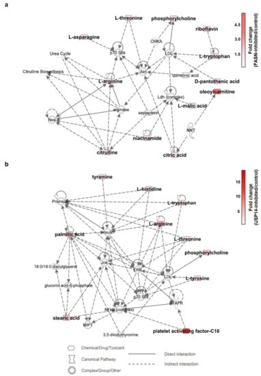 Metabolic network analysis using Ingenuity Pathway Analysis (IPA) software. The network shows altered metabolites involved in (a) FASN-inhibited and (b) USP14-inhibited LNCaP cells. The red nodes indicate the upregulated molecules, and the intensity indicates the fold change. The specific metabolites involved in network (a) are asparagine, pantothenic acid, citric acid, riboflavin, arginine, citrulline, malic acid, niacinamide, and oleoylcarnitine. In network (b), they are histidine, palmitic acid, stearic acid, tyramine, and PAF-C16. The two networks show different examples of small molecule biochemistry and molecular transport.