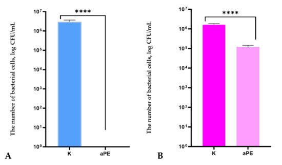 The influence of active polyethylene film (aPE) on Gram-positive bacteria growth A: S. aureus; B: B. subtilis. K—PE film; aPE—PE film containing a mixture of CO2 extracts of raspberry seeds, pomegranate seeds, and rosemary in a polymer matrix. Unpaired t-test: ****—p < 0.0001.