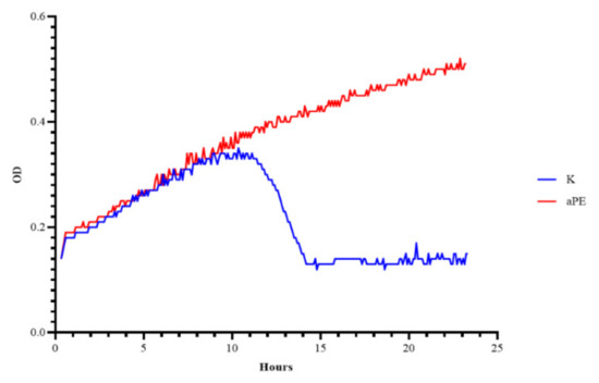 OD over time for P. syringe incubated with Φ6 phages after their incubation with the aPE (phages were added when OD = 0.2, amount of phage MOI = 1). K—PE film; aPE—PE film containing a mixture of CO2 extracts of raspberry seeds, pomegranate seeds, and rosemary in polymer matrix.