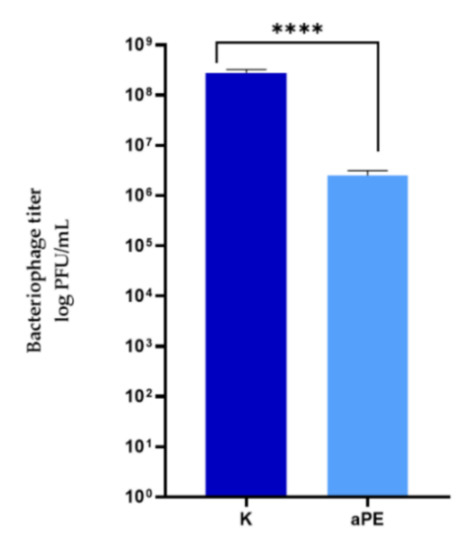 The influence of active polyethylene film on bacteriophage titer. K—PE film; aPE—PE film containing a mixture of CO2 extracts of raspberry seeds, pomegranate seeds, and rosemary in polymer matrix. unpaired t-test: ****—p < 0.0001.