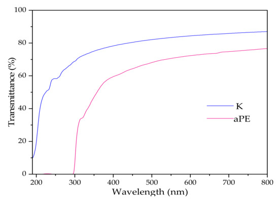 Transmittance curves at UV-Vis range of K and aPE samples.