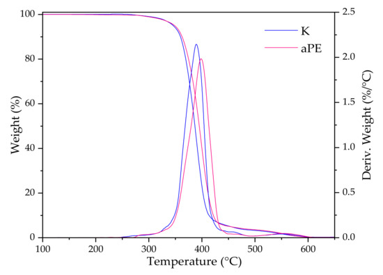 TG curves in Figure 11 show that there is no significant difference in thermal stability (the onset decomposition temperature for both samples is nearly 329 °C); however, in the case of the DTG curves, there is a noticeable difference in maximum peak: 389 °C for K and 398 °C for aPE, respectively. The modified PE is slightly more thermally stable that the neat K sample.