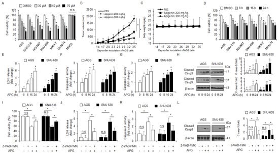 Cytotoxic effects of APG in GC cell lines. (A,D) Cell viability of dose- (0, 30, 50, and 70 µM, 24 h) and time-dependent (50 µM; 8, 16, and 24 h) APG, in GC cell lines, including AGS, SNU-216, NCI-N87, SNU-638, MKN-7, and MKN-74, and lung normal cell line MRC5 measured using the WST-1 assay on 96-well plates. (B,C) AGS cells (1 × 107) were implanted (sc) into the thigh on the right hind leg of nude mice (n = 10/group). APG (200 or 300 mg/kg) or PBS was administered intraperitoneally (ip) once a day for two days. The longest (L) and shortest (W) axes of the tumors were measured, and the tumor volume (mm3) was calculated as LW2/2. Body weights of the AGS tumor xenograft mice were determined twice a week during the experiment. (E–H) APG was treated in a time-dependent manner (50 µM; 8, 16, and 24 h), and the LDH assay and caspase-3 and caspase-9 activity assays were performed. Western blot analyses of cleaved caspase-3 and -9 for the indicated times in APG-treated AGS and SNU-638 cells; * p < 0.05. β-actin was used as a protein loading control. (I–L) The effect of Z-VAD-FMK (50 μM) and APG treatment. AGS and SNU-638 cells were pre-treated with Z-VAD-FMK for 4 h and were subsequently treated with APG (50 μM, 24 h). Cell viability was determined using the WST-1 assay; cell cytotoxicity was monitored using the LDH assay, and caspase-3 activity was assessed using the caspase-3 activity assay; * p < 0.05, n.s; no signaificant. Sampling of total lysates was performed using the Western blot assay to identify the activation of apoptosis marker cleaved caspase-3. β-actin was used as a protein loading control.