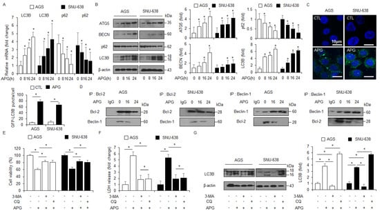 Stimulation of autophagy in APG-mediated GC cell lines. (A) Real-time RT-PCR analyses of LC3B and p62 in AGS and SNU-638 cells treated with APG (50 μM) for the indicated times. (B) Western blot analyses of ATG5, Beclin-1, p62, and LC3B protein levels in AGS and SNU-638 cells treated with APG (50 μM) for the indicated times. (C) AGS and SNU-638 cells treated with or without APG (50 μM) for 8 h were stained using the Cyto-ID autophagosome detection kit and analyzed as described in the Materials and Methods section. Fluorescence microscopy analysis analyzed by puncta of autophagosome staining; * p < 0.05. (D) AGS and SNU-638 cells were treated with APG (50 μM) for the indicated times. Bcl-2 was immunoprecipitated in AGS and SNU-638 cells, and the immunoprecipitated proteins were subjected to Western blot analyses. Beclin-1 was detected in immunoprecipitates prepared with anti-Bcl-2 antibody by immunoprecipitation. Bcl-2 was also monitored in immunoprecipitates prepared with anti-Beclin-1 antibody by immumoprecipitation. (E–G) Cell viability and LDH release were analyzed using WST-1 and LDH cytotoxicity assays in APG-treated AGS and SNU-638 cells with 3-MA (5 mM) or CQ (20 μM) treatment; * p < 0.05. Western blot analyses of LC3B in APG-induced AGS and SNU-638 cells with 3-MA (5 mM) or CQ (20 μM). β-actin was used as a protein loading control.