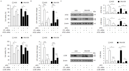 Autophagy inhibition regulates APG-induced cell death. (A–F) After AGS and SNU-638 cells were transfected with LC3B and ATG5 siRNAs, cell viability, LDH production, and Western blot analyses were performed with/without APG (50 μM, 24 h) treatment. Cell viability and LDH activity were determined using WST-1 and LDH assays, respectively; * p < 0.05, n.s; no significant. Western blotting was performed to identify the autophagy-related genes ATG5 and LC3B in APG-treated ATG5 or LC3B knockdown cells. β-actin was used as a protein loading control.