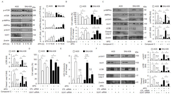 AMPKα–ULK1 axis modulates autophagic cell death in APG-treated GC cells. (A) AGS and SNU-638 cells were treated with APG (50 μM) in a time-dependent manner (0, 8, 16, and 24 h). Western blot analyses were performed for p-mTOR, mTOR, p-AMPKα (Thr172), AMPKα, p-ULK1 (Ser555), ULK1, p-mTOR (Ser2448), and mTOR in APG-treated AGS and SNU-638 cells. β-actin was used as a protein loading control. (B,C) Cell viability, LDH release, and Western blot analyses were performed for p-AMPKα, AMPKα, p-ULK1, ULK1, cleaved caspase-3, and LC3B in APG (50 μM, 24 h)-induced AGS and SNU-638 cells in the presence or absence of compound C (2 μM, 24 h); * p < 0.05, n.s; no significant. β-actin was used as a protein loading control. (D–F) Cell viability, LDH release, and Western blot analyses of p-ULK1, ULK1, LC3B, and cleaved caspase-3 in AGS and SNU-638 cells treated with APG (50 μM, 24 h) in the presence or absence of ULK1 siRNA (30 nM, 24 h); * p < 0.05, n.s; no significant. β-actin was used as a protein loading control.