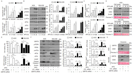 APG induces ER stress and cell death via intracellular Ca2+ release. (A) AGS and SNU-638 cells were treated with APG (50 μM) in a dose- (0, 10, 30, and 50 μM; 24 h) and time-dependent manner (0, 8, 16, and 24 h; 50 μM), and intracellular Ca2+ release was determined using intracellular Ca2+ assay. (B) AGS and SNU-638 cells were treated with APG (50 μM) for the indicated times, and the activation of ER stress signaling, including GRP78, p-PERK, PERK, p-eIF2α, eIF2α, ATF4, and CHOP, was assessed using the Western blot assay. β-actin was used as a protein loading control. (C) AGS and SNU-638 cells were treated with APG (50 μM) in a time-dependent manner, and mRNA levels of ATF4 and CHOP were investigated using real-time RT-PCR. (D) AGS and SNU-638 cells were treated with APG at the indicated doses (0, 30, and 50 μM, 24 h), and exosomes were extracted from the cell culture media. Protein samples extracted from cell lysates and exosomes were quantified by Ponceau S staining. These samples were obtained by Western blotting using the ER stress marker GRP78 and the exosome marker CD63. (E) AGS and SNU-638 cells were transfected with GRP78-specific siRNA in the presence or absence of APG (50 μM, 24 h), and cell viability and LDH assays were performed; * p < 0.05, n.s; no significant. (F) Western blot analysis of GRP78, p-PERK, PERK, p-eIF2α, eIF2α, ATF4, CHOP, and cleaved caspase-3 in APG (50 μM, 24 h)-treated AGS and SNU-638 cells in the presence or absence of GRP78 siRNA (30 nM, 24 h). β-actin was used as a protein loading control. (G) Western blot analysis of GRP78 and CD63 in exosomes extracted from APG (50 μM, 24 h)-treated AGS and SNU-638 cell culture media in the presence or absence of GRP78 siRNA (30 nM, 24 h). β-actin and Ponceau S were used as protein loading controls.