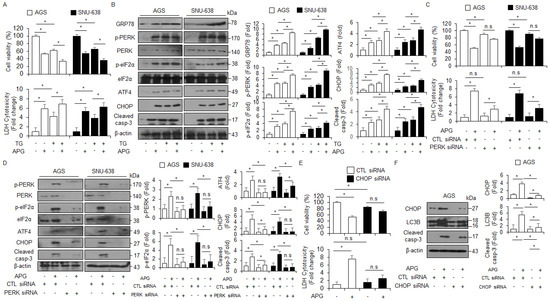 Targeting of ER stress signaling regulates APG-induced autophagic cell death in GC cells. (A,B) Western blotting of GRP78, p-PERK, PERK, p-eIF2α, eIF2α, ATF4, CHOP, and cleaved caspase-3 levels was determined using WST-1 and LDH assays in thapsigargin (3 μM, 24 h)- and APG (50 μM, 24 h)-treated GC cells; * p < 0.05. (C–F) After AGS and SNU-638 cells were transfected with PERK (30 nM, 24 h) and CHOP (30 nM, 24 h) siRNAs, cell viability, LDH production, and Western blot analyses were performed with/without APG (50 μM, 24 h) treatment. Cell viability and LDH activity were determined using WST-1 and LDH assays, respectively; * p < 0.05, n.s; no significant. Western blotting was performed to identify the ER stress-related genes p-PERK, PERK, p-eIF2α, eIF2α, ATF4, CHOP, and caspase-3 cleavage in APG-treated PERK or CHOP knockdown cells. β-actin was used as a protein loading control.