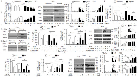 APG induces autophagic cell death via the inhibition of EZH2 in hypoxia-resistant GC cells. (A–C) AGS and AGS hypoxia-resistant (HR) cells with APG (50 μM) in a time-dependent manner. Cell cultures were also exposed to hypoxia or normoxia in a time-dependent manner. Cell viability and LDH release analyses were performed using WST-1 and LDH cytotoxicity assays; * p < 0.05. Western blot analysis was used to validate the targeted changes in HIF-1α, EZH2, ATG5, and LC3B expression in AGS and AGS-HR cells. β-actin was used as a protein loading control. (D) EZH2 binding on HIF-1α promoter using chromatin immunoprecipitation (ChIP) with or without APG- or GSK-343 (10 μM, 24 h)-induced AGS-HR cells. (E) The interaction between HIF-1α and EZH2 using co-immunoprecipitation (co-IP) in APG-induced AGS-HR cells. (F–H) AGS and AGS-HR cells were transfected with EZH2 siRNA (30 nM, 24 h) and treated with APG (50 μM, 24 h). Cell viability and LDH activity were determined using WST-1 and LDH assays, respectively; * p < 0.05. EZH2, ATG5, and LC3B were detected using the Western blot assay. β-actin was used as a protein loading control. (I–K) AGS and AGS-HR cells were treated with APG (50 μΜ, 24 h) and/or GSK-343 (10 μM, 24 h). Cell viability and LDH release analyses were performed using WST-1 and LDH cytotoxicity assays; * p < 0.05. Western blot analysis was used to validate the targeted changes in EZH2, HIF-1α, ATG5, and LC3B expression in AGS and AGS-HR cells. β-actin was used as a protein loading control.