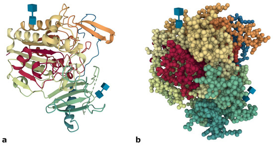 Figure 1. Crystal structure of ASB protein shown by cartoon (a) and spacefill (b) representations. Image from the RCSB PDB (http://www.rcsb.org/, accessed on 3 September 2021) [15] of PDB ID 1FSU [12], created with Mol* viewer [16].