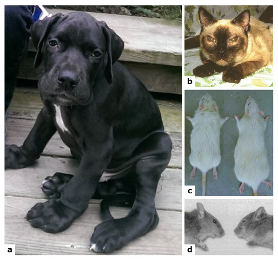 Figure 4. Photographs of some MPS VI animal models. (a) Great Dane spontaneous mutant at 4 months of age (reproduced with permission from [124]). (b) Siamese cat spontaneous mutant (reproduced with permission from [125]). (c) Rat spontaneous model (on the left) compared with wild type (on the right) at 6 months of age (reproduced with permission from [126]). (d) Mouse knock-out model (on the right) compared with wild type (on the left) aged 15 months (reproduced with permission from [122]).