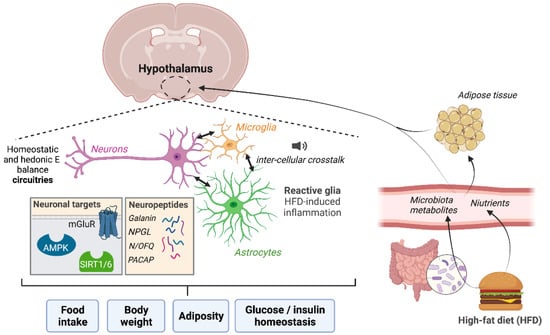In the last few decades, it has been strongly demonstrated that the hypothalamus is the master regulator of energy homeostasis. The hypothalamus contains hormone- and nutrient-sensing nuclei that organize central and peripheral responses for maintaining normal body weight, food intake, energy expenditure, and nutrient partitioning. Within the hypothalamus, specialized sub-populations of neurons are connected to each other and to various extrahypothalamic regions to coordinate energy balance. Evidence has also highlighted the participation of non-neuronal populations (i.e., microglia and astrocytes), and even the interesting cross-talk between these types of brain cells, whose disruption leads to insulin resistance and obesity. In this Special Issue, we report on the most recent insights into the hypothalamic circuitries and pathways involving neurons [3,4,5,6,7], astrocytes [8,9], and microglia [10,11] in obesity development and associated complications. The emerging contribution of astrocyte–neuron [9] and microglia–neuron cross-talks [12] in the hypothalamus and the contribution of microbiota and the gut-brain axis controlling food intake and energy homeostasis [13] are also presented in this Special Issue (Figure 1).