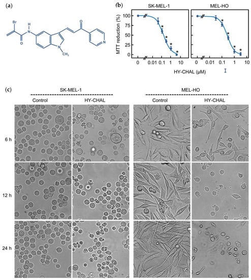 The hybrid chalcone (HY-CHAL) reduced the viability of human SK-MEL-1 and MEL-HO melanoma cells. (a) Chemical structure of the synthetic HY-CHAL; (b) Dose-response study on MTT reduction (means ± SEs; * indicates significant difference from the control at 0.05 significance level). Cells were incubated in the presence of increasing concentrations of HY-CHAL for 72 h, and thereafter mitochondrial respiratory function was determined by the MTT assay; (c) Cells were incubated with 3 μM HY-CHAL for different time periods and images were obtained with an inverted phase-contrast microscope; original magnification 20×.