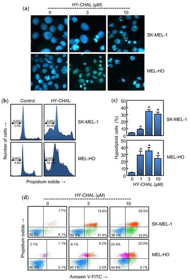 HY-CHAL induced apoptosis in melanoma cells. (a) Cells were incubated with increasing concentrations of HY-CHAL for 24 h, stained with bisbenzimide trihydrochloride, and images of representative fields were obtained with a fluorescence microscopy; (b) Representative histograms of flow cytometry study. Cells were incubated with 3 µM HY-CHAL, fixed and analyzed by flow cytometry after propidium iodide labeling. Hypodiploid cells (i.e., apoptotic cells) are shown in the region marked with a double edge arrow; (c) Cells were treated with increasing concentrations of HY-CHAL and the percentage of hypodiploid cells was determined by flow cytometry. Bars represent the means ± SEs of three independent experiments each were performed in triplicate. * p < 0.05, significantly different from untreated control; (d) Cells were incubated with the specified concentrations of HY-CHAL for 24 h, stained with annexin V-FITC and propidium iodide and analyzed by flow cytometry. Data shown are representative of three independent experiments with similar results.