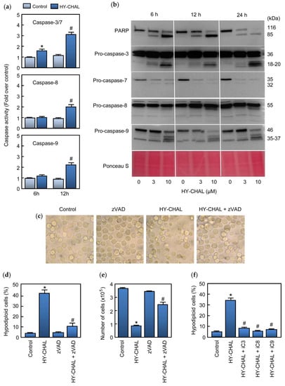 HY-CHAL induced caspase cascade in SK-MEL-1 melanoma cells. (a) Cells were treated with 3 μM HY-CHAL for the indicated times and caspase activation was determined using specific colorimetric substrates; (b) Cells were treated with the specified concentrations of HY-CHAL and poly(ADP-ribose) polymerase (PARP) cleavage and caspase processing was determined by immunoblotting. The membrane was stained with Ponceau S before antibody detection to control equal protein loading; (c) Cells were pretreated with 100 µM z-VAD-fmk for 1 h and then incubated in the absence or in the presence of 3 µM HY-CHAL for 24 h and images were obtained with an inverted phase-contrast microscope; (d) Cells were treated as in (c) and hypodiploid cells (i.e., apoptotic cells) were analyzed by flow cytometry. Bars represent the mean ± SE of three independent experiments each performed in triplicate. * Indicates p < 0.05 for comparison with untreated control. # Indicates p < 0.05 for comparison with HY-CHAL treatment alone; (e) Cells were treated as in (c) and cell viability was determined by the trypan blue exclusion method using a TC counter; (f) Cells were pretreated with the selective caspase inhibitors z-DEVD-fmk (iC3, 50 µM), z-IETD-fmk (iC8, 50 µM) and z-LEHD-fmk (iC9, 50 µM) for 1 h before the addition of 3 µM HY-CHAL and apoptotic cells were quantified as in (d).