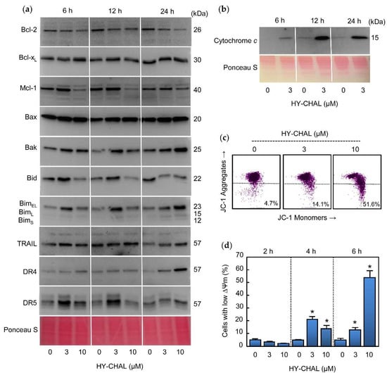 The effects of HY-CHAL on B-cell lymphoma-2 (Bcl-2) family proteins expression were evaluated since these proteins control the intrinsic apoptotic pathway and play a crucial role in protecting against cancer. To this end, cells were treated with increasing concentrations of HY-CHAL and different time periods and whole cell lysates were analyzed by immunoblotting (Figure 4a). Among the Bcl-2 proteins with anti-apoptotic activities, the expression of Bcl-2 itself, Bcl-xL (B-cell lymphoma-extra-large), and Mcl-1 (Myeloid cell leukemia 1), one of the most potent anti-apoptotic protein of the Bcl-2 family, were analyzed. There was a decrease in Bcl-2 levels which was evident with 3 µM and 10 µM HY-CHAL after 24 h of treatment. Although 3 µM HY-CHAL slightly upregulated Mcl-1, the levels of this pro-survival factor decreased after 6 h and 12 h of treatment with 10 µM HY-CHAL. In contrast, there were no changes in Bcl-xL levels at any time assayed.