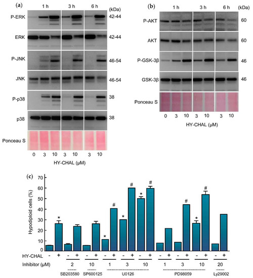 Effect of HY-CHAL on MAPK and AKT pathways. (a) Time-dependent phosphorylation of ERK1/2, JNK/SAPK and p38MAPK and (b) of AKT and GSK-3β by HY-CHAL. Cells were incubated with the concentrations specified for the time periods shown. Lysates were analyzed on Western blots probed with specific antibodies to ascertain the phosphorylation of MAPKs, AKT, and GSK-3β. Membranes were stripped and reprobed with specified antibodies as loading controls. Equal protein loading was also controlled by staining the membrane with Ponceau S; (c) Effect of MAPKs and PI3K inhibitors on HY-CHAL-induced cell death. Cells were preincubated with the p38MAPK inhibitor SB203580 (2 µM), the JNK/SAPK inhibitor SP600125 (10 µM), the indicated concentrations of the MEK1/2 inhibitors U0126 and PD98059 or the PI3K inhibitor LY294002 (20 µM) and then treated with 3 µM HY-CHAL for 24 h. The percentages of hypodiploid cells were determined by flow cytometry after propidium iodide staining. Bars represent means ± SEs of two independent experiments performed in triplicate. * Indicates p < 0.05 for comparison with untreated control. # Indicates p < 0.05 for comparison with HY-CHAL treatment alone.