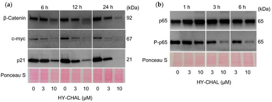 HY-CHAL downregulated β-catenin, c-myc and p21Cip1/WAF1, and inhibited NF-κB. (a,b) Cells were treated with the specified concentrations of HY-CHAL for the indicated times and cell lysates were probed with the specified antibodies. Equal loading was controlled by staining the membrane with Ponceau S.