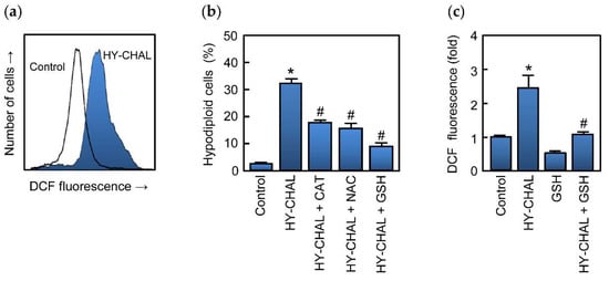 Role of ROS in HY-CHAL-induced cell death. (a) Representative histogram obtained by flow cytometry of the fluorescence of oxidized H2DCF after treatment of SK-MEL-1 with 3 μM HY-CHAL for 1 h; (b) Cells were preincubated with catalase (500 units/mL), N-acetyl-L-cysteine (5 mM), or glutathione (5 mM) and then treated with HY-CHAL (3 µM) for 24 h and thereafter the percentage of hypodiploid cells was determined by flow cytometry; (c) Fluorescence obtained by the oxidation of H2DCF of cells preincubated with glutathione (5 mM) for 2 h and then incubated with HY-CHAL (3 µM) as in (a). * Indicates p < 0.05, significantly different from untreated control. # Indicates p < 0.05, significantly different from HY-CHAL.