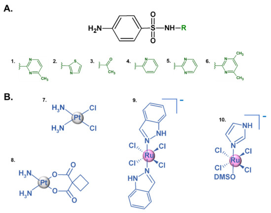 The general formula of sulfonamide-based antibacterial drugs and their examples: 1. sulfamerazine (SMZ), 2. sulfathiazole (STZ), 3. sulfacetamide, 4. sulfapyridine, 5. sulfadiazine, 6. sulfamethazine (A). Structures of the most well-known metal-containing drugs 7. cisplatin, 8. carboplatin, 9. NAMI-A, 10. KP1019 (B).