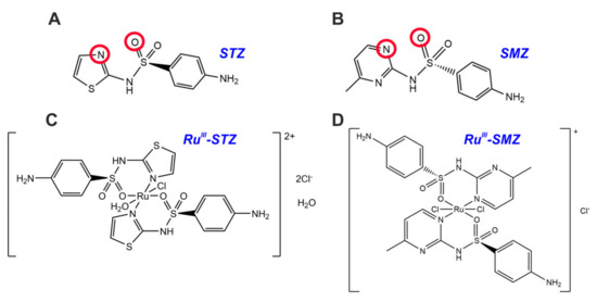 The selected STZ and SMZ sulfonamide derivatives were found to play two roles. The first one corresponds to their structures as representatives of the class of sulfonamides antibacterial drugs. This finding suggests that STZ and SMZ can be simple and useful models for improving the biological and chemical changes resulting from coordination with Ru(III) and the formation of adequate, stable complexes. The second role corresponds to their nature as sulfonamides ligands (Figure 2A,B) having an affinity for Ru(III) ions, which may allow creating a sulfamide-ruthenium drug (Figure 2C,D) with a significantly increased therapeutical index compared to the original sulfa-ligand.