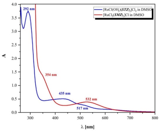UV-Vis spectra of: (blue line) [RuCl(OH2)(STZ)2]Cl2·H2O (1); (red line) [RuCl2(SMZ)2]Cl (2) complexes’ solutions (DMSO).
