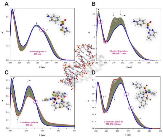 Changes observed in absorption spectra of (A) STZ (14 μM), (B) SMZ (66 μM), (C) [RuCl(OH2)(STZ)2]Cl2·H2O (28 μM), (D) [RuCl2(SMZ)2]Cl (80 μM) solutions. These spectra were registered in 5 mM Tris-HCl (50 mM NaCl) buffer pH 7.39 in the presence of different concentrations of DNA from 0–114 μMbp. The absorbance changes at selected wavelengths were included in Supplementary Materials Figure S15.