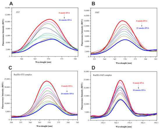 Changes observed in fluorescence emission spectra of (A) SMZ (18 μM), (B) STZ (24 μM), (C) Ru(III)-SMZ complex (69 μM), and (D) Ru(III)-STZ complex (146 μM), with increasing of CT-DNA given in nmoles, (λexc = 260 nm, λem = 570 nm).