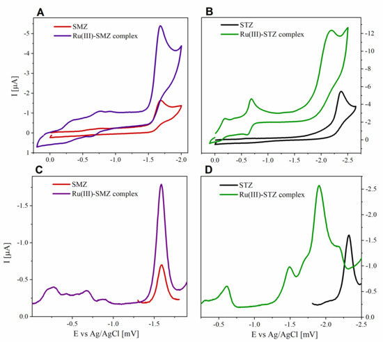 Voltammograms registered for studied ligands and complexes (concentration of 2·10−3 M) in DMSO (A) CV of SMZ and Ru(III)-SMZ complex (B) CV of STZ and Ru(III)-STZ complex (C) DPV of SMZ and Ru(III)-SMZ complex (D) DPV of STZ and Ru(III)-STZ complex.
