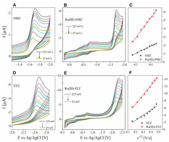 Voltammograms in DMSO registered for (A) SMZ, (B) Ru(III)-SMZ, (D) STZ, (E) Ru(III)-STZ, registered at different values of scan rate (from 25 mV·s−1 to 225 mV·s−1). Plots of reduction current I vs. v1/2 for (C) (■) SMZ (r2 = 0.998) and (●) Ru(III)-SMZ (r2 = 0.999) and (F) (■) STZ (r2 = 0.950) and (●) Ru(III)-STZ (r2 = 0.994).