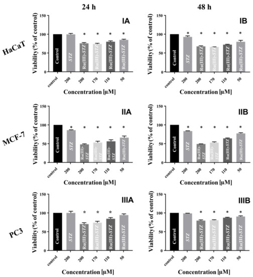 The viability of I. HaCaT, II. MCF-7 and III. PC3 cells after: (A) a 24 and (B) a 48 h treatment with STZ and Ru(III)-STZ complex in the range of concentration from 0 (control) to 200 µM. Results are shown as mean ± SD of three independent experiments performed in triplicate. * Statistically significant difference is present between treated cells compared with untreated cells (control).