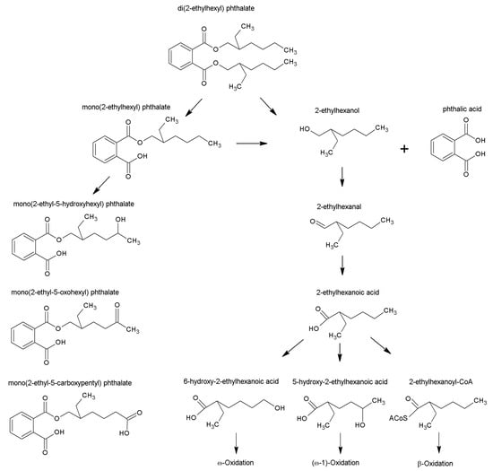 - Albro, P.W. The metabolism of 2-ethylhexanol in rats. Xenobiotica 1975, 5, 625–636. [Google Scholar] [CrossRef]