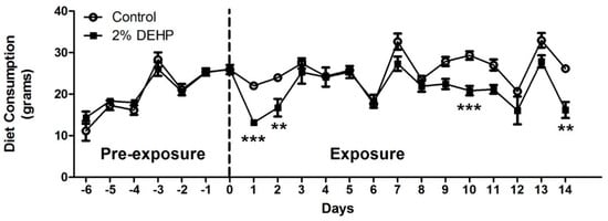 Effects of 2% DEHP exposure on diet consumption throughout the study duration (7 day pre-exposure and 14 day exposure) (n = 7 per group). Significant differences are indicated with; ** p< 0.01 and *** p < 0.0001.