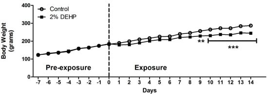 Effects of 2% DEHP exposure on body weights of male Wistar rats throughout the study duration (7 day pre-exposure and 14 day exposure) (n = 7 per group). Significant differences are indicated with; ** p < 0.01 and *** p < 0.0001.