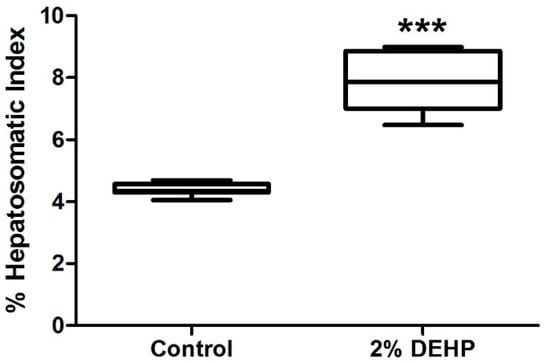 A significant decrease of rat body weights was evident from Day 9 and onwards for the 2% DEHP exposed group (p < 0.05) (Figure 3). In contrast, hepatosomatic index showed a significant increase in liver weights for 2% DEHP exposed rats relative to Control (Figure 4). While body weight loss is likely due to reduced diet consumption and elevated lipid metabolism (contributing to a ‘lean’ phenotype) [,]; increased liver weight suggests hepatomegaly due to peroxisomal proliferation [,].