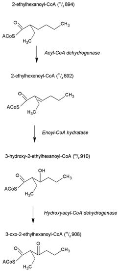 Metabolic pathway detailing the partial β-oxidation of 2-ethylhexanoyl-CoA to 3-oxo-2-ethylhexanoyl-CoA (adapted from Walker and Mills []; English et al. []). The mass transitions listed for each intermediate metabolite (in parenthesis) were confirmed by mass spectrometry in our study.