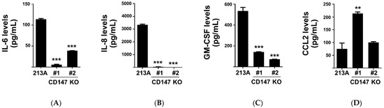 The selected four inflammatory cytokine levels in KKU-213A (213A) and CD147 KO clones (#1 and #2) CM. (A) IL-6, (B) IL-8, (C) GM-CSF, and (D) CCL2 levels are shown. The data are means ± SEM from representative experiments. ** p < 0.01, *** p < 0.001.