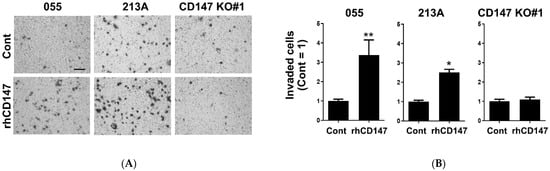 Recombinant hCD147 promoted CCA invasion in CD147-expressing cells. (A) CD147-mediated CCA invasion determined by Matrigel-coated Boyden chamber assay. (B) Relative cell invasion in unstimulated (Cont) and rhCD147-treated KKU-055 (055), KKU-213A (213A), and CD147 KO#1 cells. Mean invaded cell numbers in unstimulated conditions were set as 1. The data are means ± SEM from representative experiments. * p < 0.05, ** p < 0.01. Bar = 50 μm.