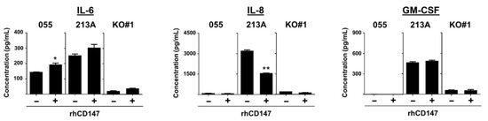 Recombinant hCD147-potentiated IL-6 production in CCA cells. (A) IL-6, (B) IL-8, and (C) GM-CSF were determined in rhCD147-treated KKU-055 (055), KKU-213A (213A), and CD147 KO#1 (KO#1) cells. Cytokine levels in CM were measured by ELISA. The data are means ± SEM from representative experiments. * p < 0.05, ** p < 0.01. − = untreated, + = rhCD147-treated condition.