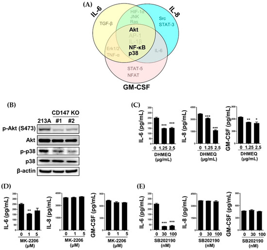 Potential molecules involved in CD147-induced proinflammatory cytokine production. (A) Regulatory molecules involved in selected proinflammatory cytokine production are grouped. The potential molecules that are controlled by CD147 and regulate IL-6, IL-8, and GM-CSF are emphasized by bold letters. (B) The expressions of p-Akt, Akt, p-p38, and p38 in parental and CD147 KO clones (#1 and #2). IL-6, IL-8, and GM-CSF levels were determined in (C) DHMEQ, (D) MK-2206, and (E) SB202190-treated KKU-213A cells. The data are means ± SEM from representative experiments. The numbers on the x-axis indicate the inhibitor concentrations. * p < 0.05, ** p < 0.01, *** p < 0.001.
