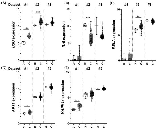 Expression profiles of BSG (A), IL-6 (B), RELA (C), AKT1 (D), and MAPK14 (E) in CCA tissues (C) compared to adjacent noncancerous tissues (A) or normal bile ducts (N) from 3 different datasets: #1 = TCGA-CHOL, #2 = GSE26566, and #3 = GSE89749. Normalized expression levels of individual samples are presented with individual dots; #1 = log2(FPKM+1), and #2 and #3 = log2 (quantile normalization). Dots represent an expression level from an individual sample. Bars indicate minimum to maximum levels. * p < 0.05, ** p < 0.01, *** p < 0.001.