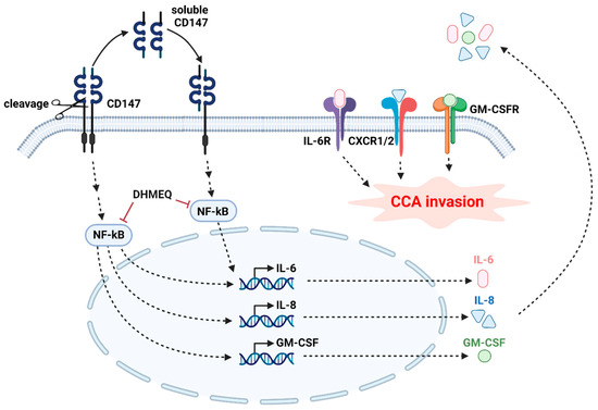 Proposed mechanism of CD147-induced cytokine production and mediated invasion in CCA. Roles of soluble CD147 are demonstrated. The involvements of NF-κB translocation and CD147 homophilic interaction in the CD147-dependent mechanism are suggested. Modulation of CD147, NF-κB translocation, or proinflammatory cytokine actions might, therefore, slow the disease progression and improve the prognosis.